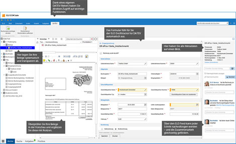 ELO for DATEV verbindet das Dokumentenmanagementsystem ELO mit dem DATEV Rechnungswesen. Dadurch entsteht eine durchgängige Lösung für die Bearbeitung von Rechnungsbelegen - von der Archivierung über die Freigabe bis hin zur automatischen Verbuchung in Ihr DATEV Rechnungswesen.